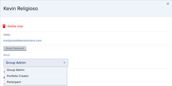 Each user in Decision Lens must be assigned a role. Group Admins can change the role of a user by clicking on the user and selecting a new role: