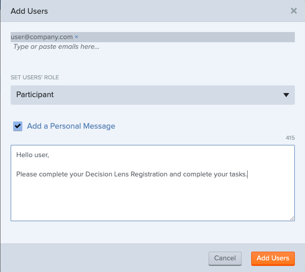 The matrix below describes the conditions (action & role) that will trigger a system email to one or more users in Decision Lens. The email templates are pre-configured and not editable by system administrators. In some actions such as User Registration there is an option to add a personal message to the outgoing email.